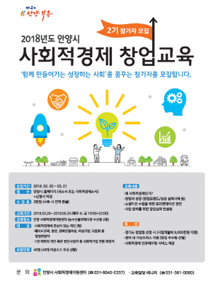 3월 21일까지 40명을 모집하며, 매주 2회 안양시사회적경제지원센터에서 ▲ 왜 사회적경제인가? ▲ 창업과 성장(창업트렌드/성공 실패사례 등) ▲ 소셜미션 수립을 위한 프리젠테이션 경연 ▲ 사업 준비를 위한 창업심화 컨설팅 등의 교육 프로그램을 운영한다.