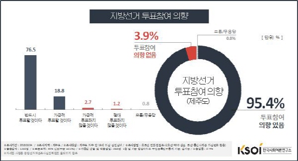 6월13일 제 7회 전국동시지방선거 투표참여 의향에 대한 질문에 제주도 응답자의 95.4%가 투표에 참여할 의향이 있다고 답했으며 특히 '반드시 투표하겠다'는 적극 투표층이 76.5%로 매우 높게 나타났다.