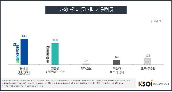 더불어민주당 후보로 문대림 전 청와대 비서관, 바른미래당 후보로 원희룡 현 제주도지사의 출마한 양자 가상대결에서는 더불어민주당 문대림 전 청와대 비서관이 43.1%로 35.9%인 바른미래당 원희룡 현 제주도지사에게 오차범위 밖의 승리를 거두는 것으로 나타났다.