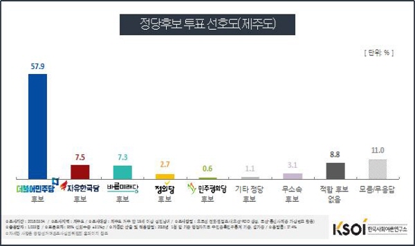 오는 6월 13일 실시되는 지방선거에서 제주도민 57.9%는 더불어민주당 제주도지사 후보에게 투표하겠다고 응답하였으며, 자유한국당 후보에게 투표하겠다는 응답은 7.5%에 그쳐 오는 지방선거에서 더불어민주당의 승리가 예상되고 있다. 이어 '바른미래당 후보' 7.3%, '정의당 후보' 2.7%, '민주평화당 후보'는 0.6% 순으로 조사됐다.