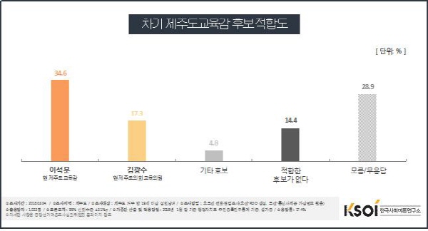 - 이석문 현 제주도 교육감 34.6%, 김광수 현 제주도의회 교육의원 17.3%