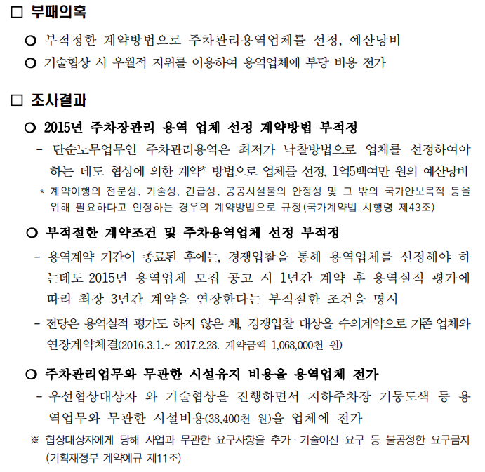 그리고 계약종료 후에는 경쟁 입찰을 통해 용역업체를 선정해야함에도 1년 계약 후 용역실적 평가에 따라 최장 3년간 계약을 연장한다는 부적절한 조건을 명시하였고, 이마저 용역실적 평가도 하지 않은 채 수의계약으로 계약연장을 해서 징계를 받았다. 다년간에 걸쳐 주차장 용역문제가 벌어지는 동안 문체부는 알고 감사하였는데 예술의전당 자체 내에서는 몰랐다면 예술의전당의 도덕적 해이는 심각한 수준이다. 그럼에도 종합감사는 없었다.