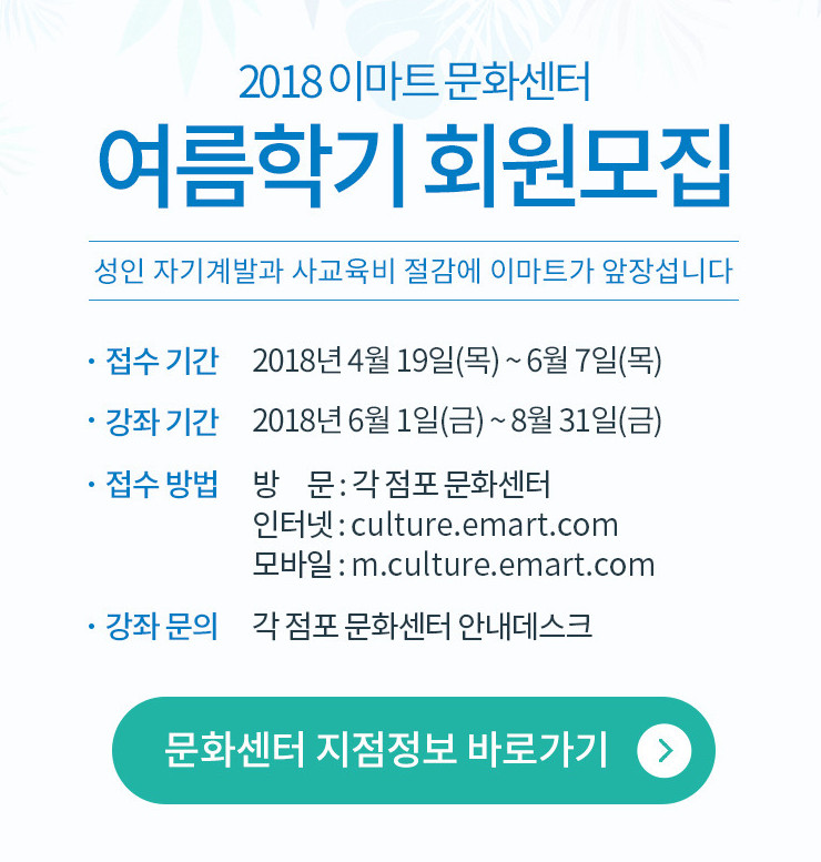 이마트 문화센터는 성인 자기계발과 사교육비 절감에 앞장서겠다는 취지로 여름학기 회원을 모집한다고 공지했다.