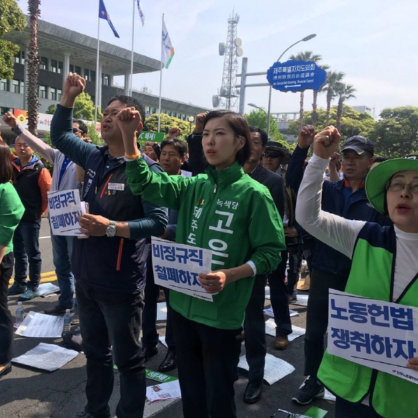 고은영 예비후보는 "비정규직 없는 제주도를 함께 만들어 나가겠다는 연대의 의지를 표하고자 참석했다"며 "제주는 국제자유도시라는, 신자유주의의 실험장이 돼 어느 지역보다 비정규직의 비율이 높은 지역이다. 제주의 민낯"이라고 지적했다.
