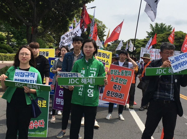 한편 고 후보는 이 날 대회에 참석해 '제주 난개발 마피아 JDC(제주국제자유도시개발센터) 해체' 플랭카드를 들고 노동자들과 함께 행진했다.