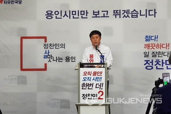 자유한국당 정찬민 용인시장 예비후보가 21일 용인시청 브리핑룸에서 기자회견을 갖고 재선도전 출마를 선언했다. 정 후보가 당선되면 지방자치선거가 실시된 지난 1995년 이후 용인에서는 최초의 재선시장이 된다. 지금까지 용인에서는 전임 시장 들이 비리와 연루되면서 한 번도 재선시장이 나오지 않았다.