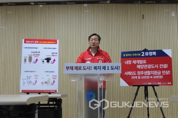 유 후보는 "지난 4년 동안 인천을 세계 최고의 해양경쟁력을 갖춘 해양도시로 키우고, '애인(愛仁)섬 프로젝트'를 통해 섬 경쟁력을 높이겠다."며, "남북간 접경지역인 특성으로 생업에 많은 어려움을 겪고 있는 주민들을 위해 많은 노력을 기울여 왔다."고 주장했다.
