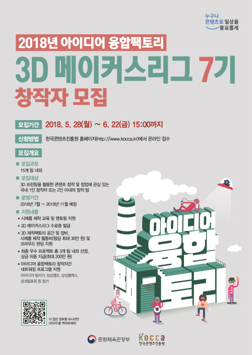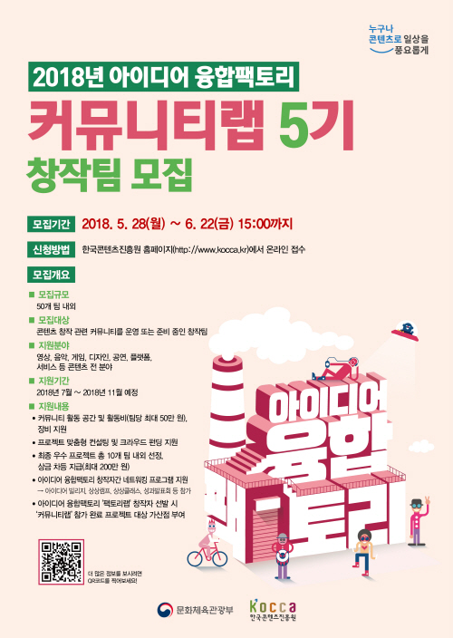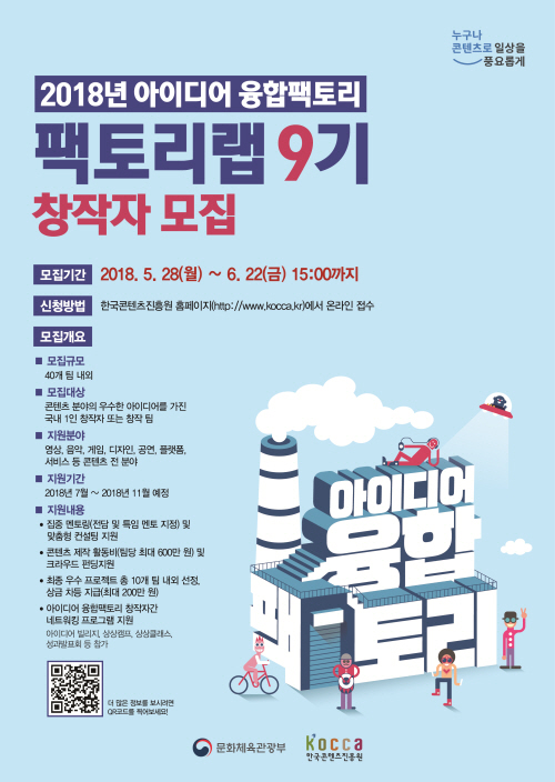 (서울=국제뉴스) 하명남 기자 = 한국콘텐츠진흥원(KOCCA·원장 김영준)은 크리에이터의 창작 활동과 창업을 지원하기 위한 '2018년 아이디어 융합팩토리' 프로그램 참여자를 모집한다.아이디어 융합팩토리는 개인의 상상력이 창작으로 이어지고, 창작 활동이 창업으로 연결될 수 있도록 산업 환경을 조성하는 사업이다.