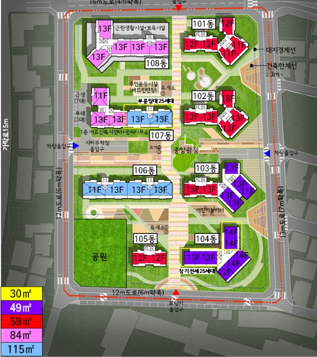 아울러 단지내 주민공동이용시설로 다목적실(830㎡), 보육시설(375㎡), 어르신복지센터(225㎡), 작은도서관(160㎡) 등을 설치하고, 공공성 확보차원에서 공원부지(1,482㎡)와 도로부지(1,012㎡)를 기부채납하는 계획도 포함하고 있다.
